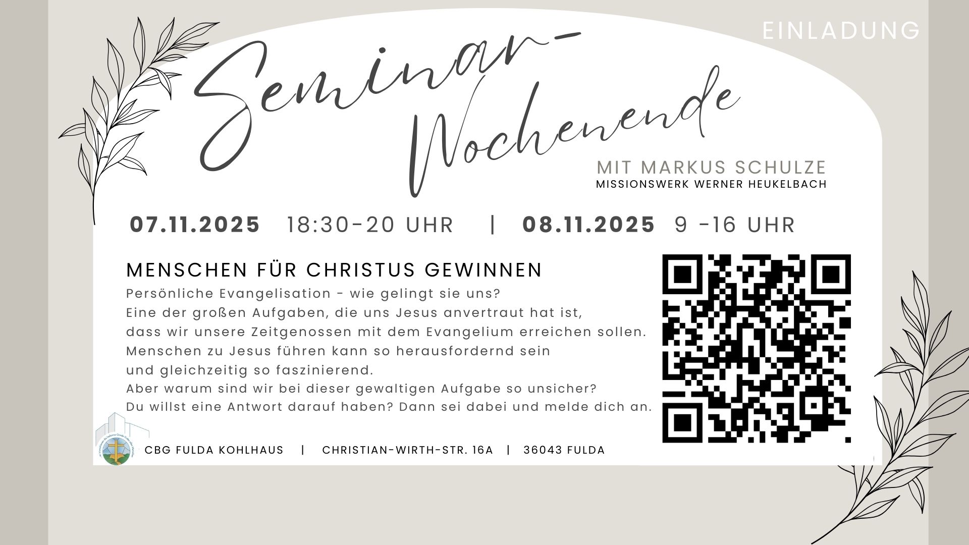 Wie in jedem Jahr, laden wir im November wieder alle zu unserem jährlichen Wochenende ein. Diesmal haben wir uns ein spannendes Rahmenprogramm ausgedacht, einen Gastredner eingeladen, der uns das Thema „Menschen für Christus gewinnen“ näher bringt.